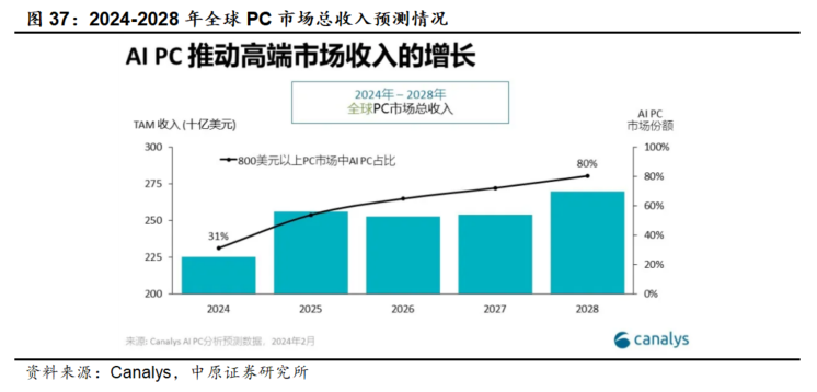 AI PC有望推动高端PC市场收入增长。AI PC集成了专用于AI的加速器,将释放出高生产力、个性化及能效方面的新功能,颠覆整个PC市场,并为厂商及其合作伙伴带来显著的价值收益。根据Canalys的预测,与未集成 NPU 的传统 PC 相比,AI PC 将溢价 10%-15%;随着采用率的激增,到2025年底,价格在800美元及以上的PC将有一半以上是AI PC,到2028年,这一比例将增至80%以上。因此,800美元及以上的PC出货量将在短短四年内增长到市场的一半以上,这将有助于推动PC出货的整体价值从2024年的2250亿美元增长到2028年的2700亿美元以上。