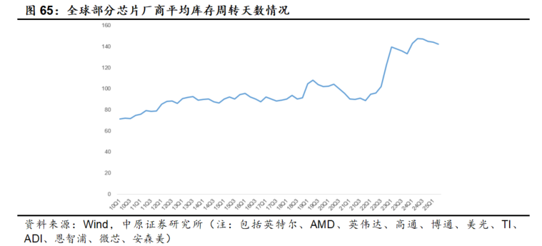全球部分芯片厂商25Q2库存水位环比小幅下降。根据Wind的数据,全球部分芯片厂商包括英特尔、AMD、英伟达、高通、博通、美光、TI、ADI、恩智浦、微芯、安森美23Q1的平均库存周转天数为139天,23Q4下降至133天,随后开始环比提升,24Q2提升至148天,24Q3为147天,环比基本持平,24Q4小幅下降至145天,25Q1小幅下降至144天,25Q2继续下降至142天;由于工业市场需求开始复苏,模拟厂商TI、ADI、微芯科技 25Q2库存环比有所下降;随着下游需求的回暖,库存有望逐步下降。