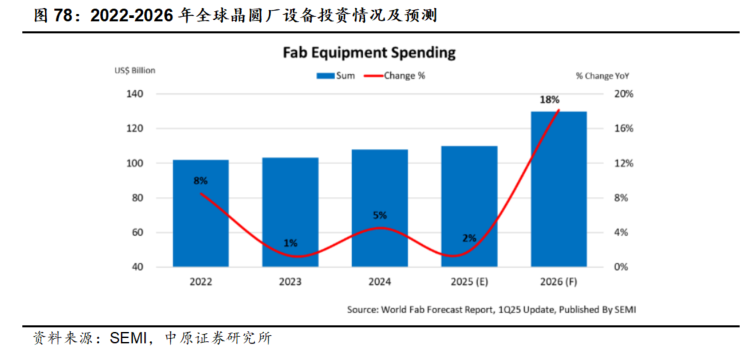 SEMI预计2025 年全球晶圆厂设备支出将同比增长2%。根据SEMI的最新预测,预计2025 年全球用于前端设施的晶圆厂设备支出自 2020 年以来连续六年增长,同比增长 2%,达到1100 亿美元;预计2026年晶圆厂设备支出将成长 18%,到达 1300 亿美元;此投资成长不仅由高效能运算(HPC)和内存类别支持数据中心扩展的需求所带动,更受惠于AI人工智能整合度不断提高,从而让边缘设备所需硅产品不断攀升所致。