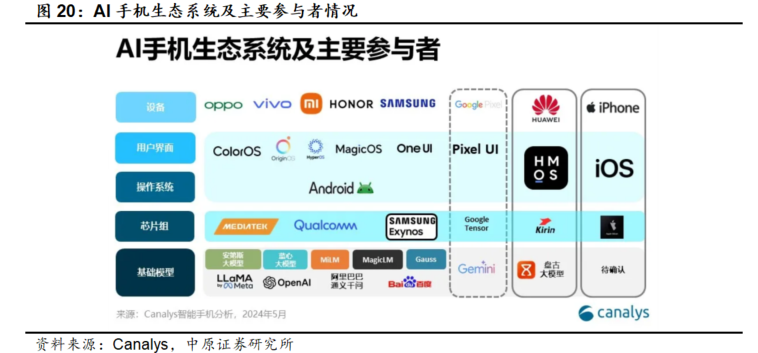生成式AI将成为智能手机厂商的重要战略,行业领导者引领AI技术。随着三星发布全新的Galaxy S24智能手机,三星将生成式AI作为长期的产品策略,同时中国厂商小米、vivo、OPPO和荣耀等也已发布具备生成式AI能力的旗舰机型。AI逐步从最初的产品层面的差异化上升至运营及公司层面的整体战略,各智能手机厂商均涉及其中。苹果、谷歌和三星等全球主要厂商以及荣耀、OPPO、小米和vivo等中国领先厂商都走在将生成式AI功能集成到其设备的前列;其战略各不相同,从开发专用AI芯片到加强利用AI的生态系统集成来提升用户体验。