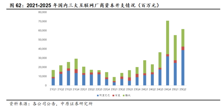 国内三大互联网厂商不断提升资本开支,25Q2阿里巴巴资本开支超预期。国内三大互联网厂商阿里巴巴、百度、腾讯2023年也开始不断加大资本开支,2025年二季度三大互联网厂商的资本开支合计为616亿元,同比增长168%,环比增长12%;25Q2阿里巴巴资本开支为386.76亿元,同比增长220%,环比增长57%;预计2025年国内三大互联网厂商将继续加大用于AI基础设施建设的资本开支。