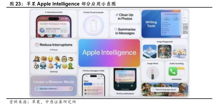 苹果推出Apple Intelligence,加速终端变革。2024年6月11日,在WWDC 2024上,苹果发布全新的个人智能系统——Apple Intelligence,Apple Intelligence将整合自有模型及OpenAI的GPT-4o模型,Apple Intelligence注重用户的隐私安全,强调在端侧处理信息和计算,以及通过私有云计算技术保护用户的个人信息;Apple Intelligence将随iOS 18、iPadOS 18及macOS Sequoia免费提供,在iPhone 15 Pro、配备M1芯片的iPad和Mac以及后续机型上支持。