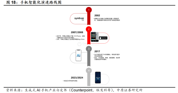 受益于AI大模型的赋能,智能手机将迎来AI新时代。通过AI技术赋能智能手机可以追溯至2017年,安卓厂商开始在其SoC平台中加入独立的 AI计算单元,用于运行和影像增强相关的深度学习模型,随后AI技术逐渐被手机厂商用于更多方面,如强化安全、优化续航、提升网络性能等,但计算、摄影一直是其最主要的应用领域,直到大模型被装进智能手机,手机AI应用从中小模型时代跨越至大模型时代。有了大模型的加持,在人机交互层面,新的多模态交互将取代传统的触控屏交互,用户可以更自然的与手机沟通;多模态输入和输出能力相结合,可以极大强化智能手机的生产力工具属性,既可以基于多种形式的输入信息,生成用户需要的图表、文本、音乐、图片甚至是视频,也可以对输入的图片、视频进行编辑。