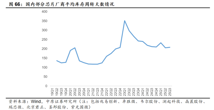 国内部分芯片厂商25Q3库存水位环比小幅提升。国内部分芯片厂商包括兆易创新、卓胜微、韦尔股份、澜起科技、晶晨股份、瑞芯微、北京君正、圣邦股份、紫光国微23Q1的平均库存周转天数达到351天,24Q1下降到240天,24Q4继续下降到210天,25Q1提升至232天,25Q2大幅下降至206天,25Q3小幅提升至208天,环比提升2天。25Q3国内部分芯片厂商库存水位环比小幅提升,目前部分芯片设计厂商库存仍偏高,预计后续有望逐步回到健康水平。