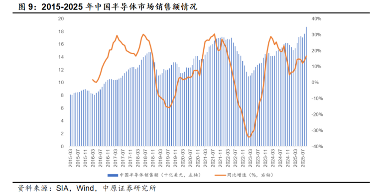 2025年9月中国半导体销售额同比增长15%,环比增长6%。根据美国半导体行业协会(SIA)的数据,2025年9月中国半导体行业销售额为187亿美元,同比增长15%,连续23个月实现同比增长,环比增长6%。