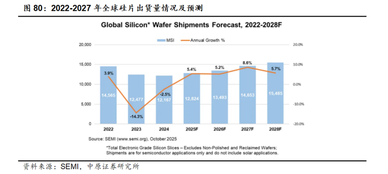 SEMI预计2025-2028年全球硅晶圆出货量将持续增长。根据SEMI的最新预测,2025年全球硅晶圆出货量预计将增长5.4%,达到12824百万平方英寸,并将在2028年前持续增长,届时市场有望达到 15485百万平方英寸的新行业纪录。2025年硅晶圆出货量的增长主要受益于人工智能相关需求的强劲推动,包括用于先进逻辑器件的高端外延晶圆,以及用于高带宽存储器(HBM)的抛光晶圆;非AI应用领域的晶圆出货量则刚刚开始从近期的下行周期中逐步恢复;预计随着AI在数据中心及边缘计算领域的持续扩展,这一稳步增长趋势将延续至2028年。