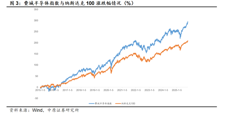 2025年10月费城半导体指数表现大幅强于纳斯达克100。2025年10月费城半导体指数上涨13.48%,10月纳斯达克100上涨4.77%,费城半导体指数走势大幅强于纳斯达克100;费城半导体指数年初至今上涨45.16%。