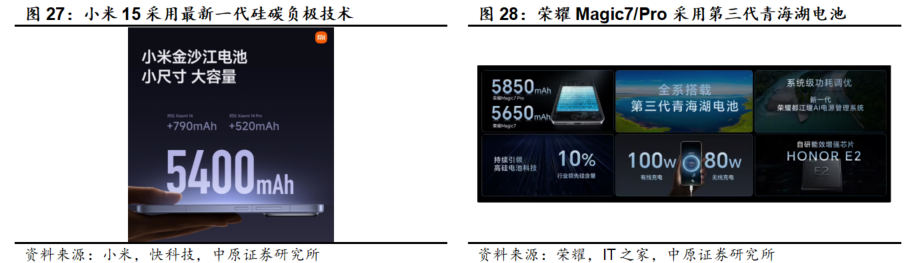 AI手机需要不断完成推理任务而带来高能耗需求,有望推动AI手机续航能力持续升级。一般智能手机采用的电池负极材料主要是石墨,石墨负极的理论克容量大约在360-370mAh/g,而硅碳负极的理论克容量可以超过4200mAh/g,远高于石墨,硅碳负极因其高理论克容量可以提供更高的能量密度,从而增加电池的续航能力。小米及荣耀最新一代的AI手机都采用硅碳负极电池,带来了更长的续航能力;小米15搭载的金沙江电池采用最新一代硅碳负极技术,电量提升至5400mAh,比上代直接增加了790mAh,能量密度提升到了850Wh/L,是小米史上最高;小米15 Pro内置了一块6100mAh的超大容量电池,这也是小米迄今为止最大的电池容量;荣耀Magic7 Pro搭载第三代青海湖电池,采用新型硅碳负极材料和全面升级的电化学体系,使得能量密度提升到了行业领先水平,电量达到5850mAh。
