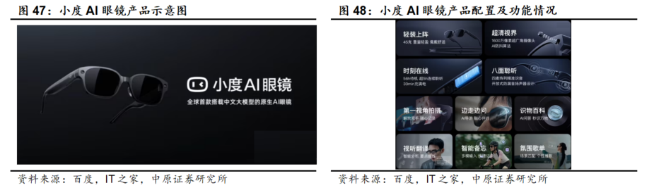 百度发布全球首款搭载中文大模型的原生AI眼镜。2024年11月12日,百度正式发布小度AI眼镜,称该产品为“全球首款搭载中文大模型的原生AI眼镜”。小度 AI 眼镜具备第一视角拍摄、边走边问、卡路里识别、识物百科、视听翻译、智能备忘等功能。小度AI眼镜支持文心大模型,对接百度地图、搜索、百科等百度应用生态。