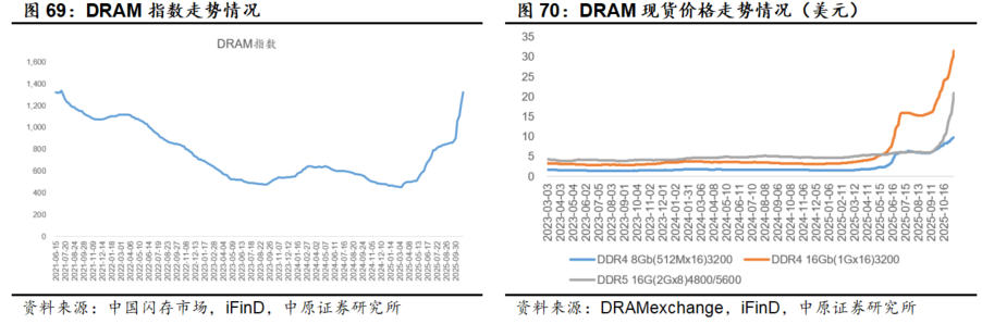 2025年10月DRAM现货价格环比大幅上涨。根据中国闪存市场的数据,2025年10月DRAM指数环比上涨33.98%,2025年3月至10月DRAM指数上涨约167%。根据DRAMexchange的数据,2025年10月,DDR4 8Gb(512Mx16)3200的现货价格环比上涨27.08%,DDR4 16Gb(1Gx16)3200的现货价格环比上涨38.49%,DDR5 16G(2Gx8)4800/5600的现货价格环比上涨101.69%。