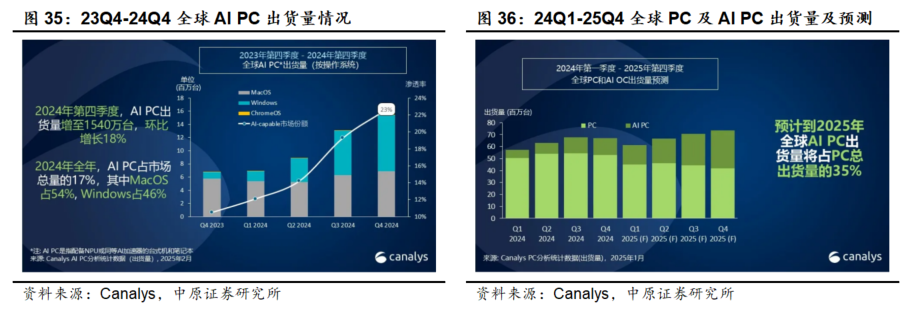 预计2025年AI PC的渗透率将达35%。根据Canalys的数据,2024年第四季度,AI PC出货量达到1540万台,占季度PC总出货量的23%;2024年AI PC占PC总出货量的17%;其中苹果以54%的市场份额领跑,联想和惠普各占12%。受Windows 10服务停止带来的换机潮,预计AI PC的市场渗透率将在2025年继续提升。展望未来,受商用需求的推动,PC市场将加速增长,企业正为Windows 10系统结束做准备;目前PC市场正致力于将AI PC打造成明星类别,根据Canalys的预测,预计2025年AI PC将占全球PC出货量的35%。