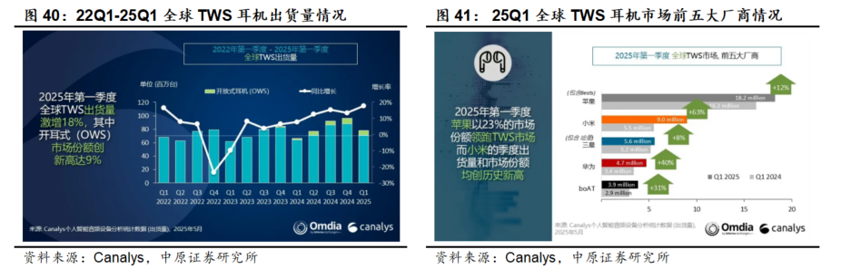25Q1全球TWS耳机出货量同比增长18%,苹果、小米、三星、华为和boAt市占率排名前五。根据Canalys的数据,2025年第一季度,全球真无线耳机(TWS)市场强劲反弹,出货量达到7800万台,同比增长18%,创下自2021年以来的最高增速,此次增长得益于厂商在地域和价格层级上的双重扩张策略。苹果(包括Beats)凭借强大的生态系统优势和对健康功能的持续整合,继续稳居全球TWS市场领导地位,市场份额达23%;小米则跃升至全球第二,得益于其在新兴市场的增长势头,出货量同比大增63%,首次突破900万台,创下11.5%的历史最高市场份额;三星(包括哈曼子公司)以7%的市场份额位居第三,其以生态为核心的Galaxy系列和主打大众市场的JBL系列出货量均有所增长;哈曼近期收购了包括Bowers & Wilkins在内的Sound United,预示其未来将在高端音频领域扩展布局;华为和印度品牌boAt分列第四、第五,分别占据6%和5%的市场份额。