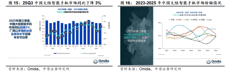 25Q3中国大陆智能手机出货量同比下降3%,vivo市场份额第一。根据Omdia 的数据,2025年第三季度,中国大陆智能手机市场同比下降3%,市场仍处于调整阶段,同时竞争格局愈发胶着,头部厂商排名差距持续收窄。25Q3 vivo以1180万台的出货量重回第一,占据18%市场份额;华为紧随其后排名第二,出货量1050万台,市场份额为16%;苹果延续上一季度的涨势,出货量1010万台,排名相较去年同期上升两位,跻身市场前三;小米出货1000万台,OPPO出货990万台,分别位列第四第五。