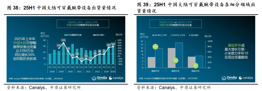 25H1中国大陆可穿戴腕带设备出货量同比增长36%。根据Canalys的数据,2025年上半年,中国大陆可穿戴腕带设备出货量达3390万台,同比增长36%,继2024年下半年33%的增长后持续强势攀升,这一增长态势创中国大陆可穿戴腕带设备市场上半年度出货量的历史新高,标志着市场进入全新发展阶段。基础手环品类以80%的惊人增速成为增长最快的细分市场,成为推动中国大陆市场强劲表现的主要动力;华为以1200万台出货量领先市场,占据36%的份额;小米紧随其后,出货量达1100万台,市场份额达32%;两家厂商均首次在上半年实现出货量突破千万台的里程碑,其中小米同比增速尤为亮眼,达到101%。