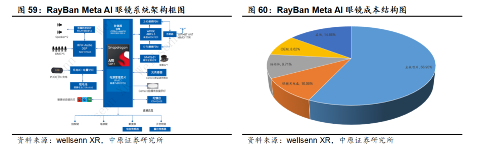 芯片占AI眼镜成本大部分,关注AI眼镜产业链核心环节投资机会。根据wellsenn XR的数据,RayBan Meta AI眼镜成本总计174美元,主板芯片的成本约99.1美元,占比约56.95%,成本占比超一半;眼镜充电盒的成本约17.5美元,占比约10.06%;结构件的成本约16.9美元,占比约9.71%;OEM的成本约15美元,占比约8.62%。AI眼镜主要芯片包括SoC、MCU、存储器、电源、射频等,建议关注SoC、存储器、光学、电池、镜片、OEM等产业链核心环节投资机会。