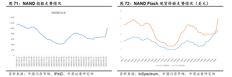 2025年10月NAND Flash现货价格环比大幅上涨。根据中国闪存市场的数据, 2025年10月NAND指数环比上涨29.69%,2025年3月至10月NAND指数上涨约55%;其中 TLC闪存256Gb的现货价格环比上涨9.37%,TLC闪存512Gb的现货价格环比上涨42.86%。