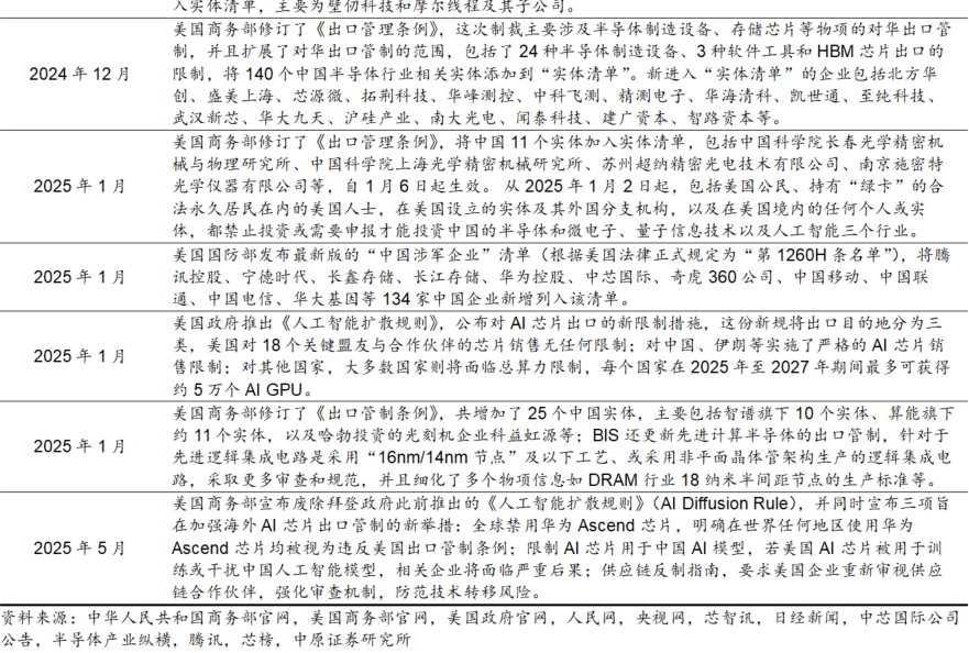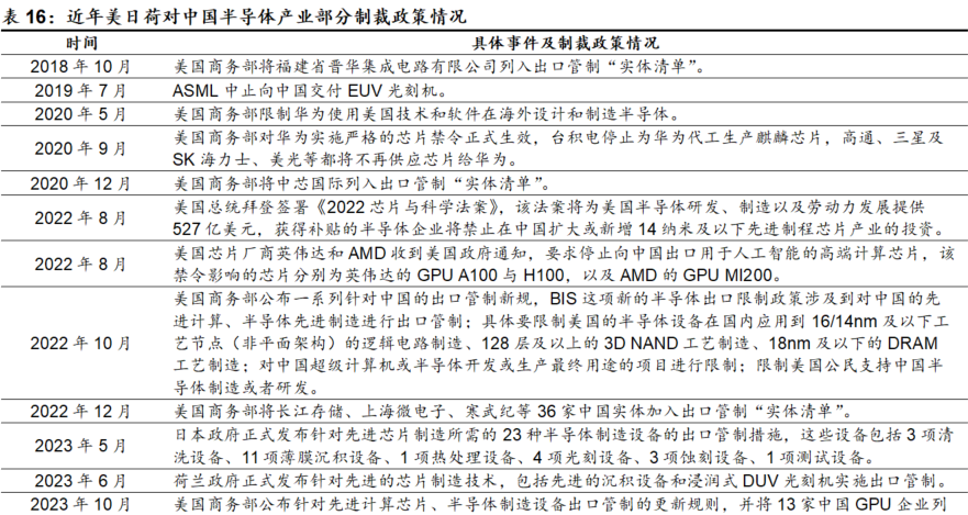 外部环境对中国半导体产业限制不断加剧。近年来美日荷不断加大对中国半导体产业的限制,主要针对半导体先进制造、先进制程半导体设备、先进存储器、先进计算芯片、EDA工具等环节。