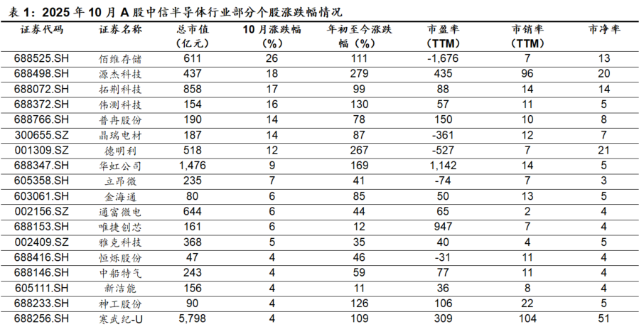 2025年10月半导体板块上涨家数远少于下跌家数, 2025年10月涨幅排名前十的公司分别为佰维存储(26%)、源杰科技(18%)、拓荆科技(17%)、伟测科技(16%)、普冉股份(14%)、晶瑞电材(14%)、德明利(12%)、华虹公司(9%)、立昂微(7%)、金海通(6%)。