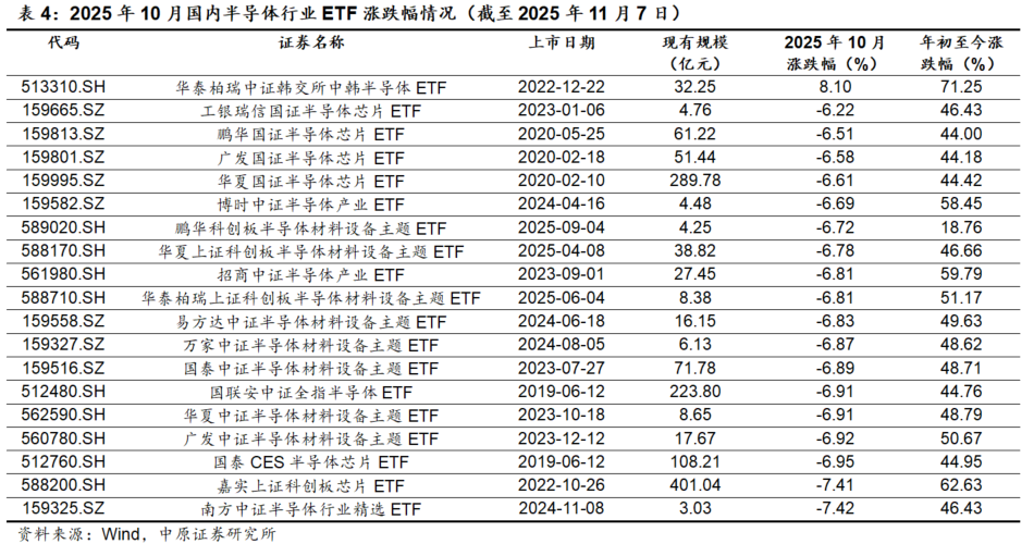 2025年10月国内半导体行业ETF多数下跌,中韩半导体ETF上涨8.10%。