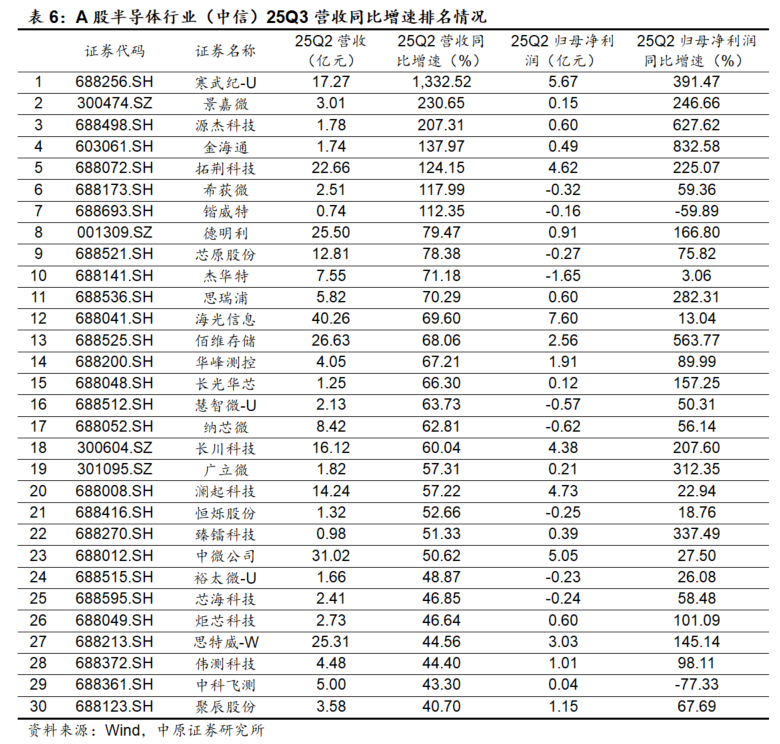 2025年三季度半导体行业营收同比增速排名前30名如下: