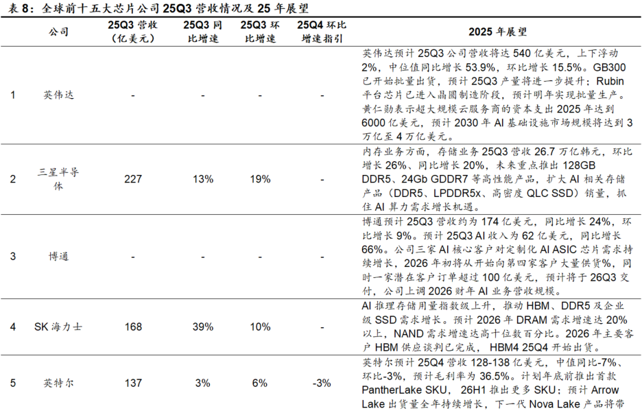 全球存储器厂商25Q3业绩表现亮眼。近期部分全球15大芯片厂商公布了25Q3季报,受益于AI推理对于存储用量大幅提升,推动HBM、DDR5及企业级SSD需求增长,存储器厂商三星、SK海力士、美光25Q3业绩实现同环比高速增长;目前DRAM、NAND供应紧张,预计2026年存储需求将继续快速增长。