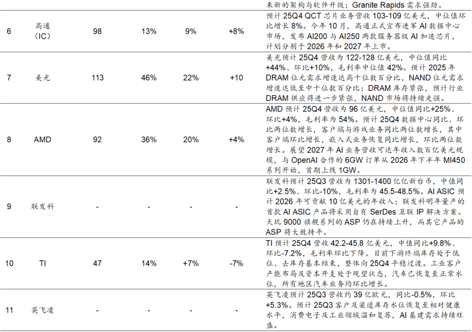 海外云厂商继续加大资本支出,存储器价格大幅上涨。2025年9月全球半导体销售额同比25.1%,连续23个月实现同比增长,环比增长7.0%;根据WSTS的预测,预计2025年全球半导体销售额将同比增长11.2%。下游需求呈现结构分化趋势, AI算力硬件基础设施需求持续旺盛, 25Q3北美四大云厂商谷歌、微软、Meta、亚马逊资本支出合计964亿美元,同比增长67%,环比增长9%;25Q2国内三大互联网厂商阿里巴巴、百度、腾讯资本开支合计同比增长168%,环比增长12%。2025年10月DRAM与NAND Flash月度现货价格大幅上涨,TrendForce上调25Q4 DRAM价格预测。根据SEAJ的数据,全球半导体设备销售额25Q2同比增长23%,中国半导体设备销售额25Q2同比下降7%,2025年9月日本半导体设备销售额同比增长14.9%,环比增长4.6%。全球硅片出货量25Q3同比增长3.1%,环比下降0.4%,SEMI预计2025年全球硅片出货量增长5.4%,2026年将继续增长5.2%。综上所述,我们认为目前半导体行业仍处于上行周期,AI为推动半导体行业成长的重要动力。