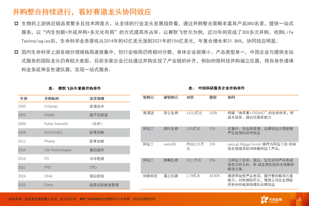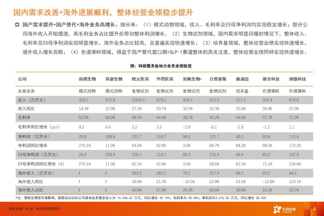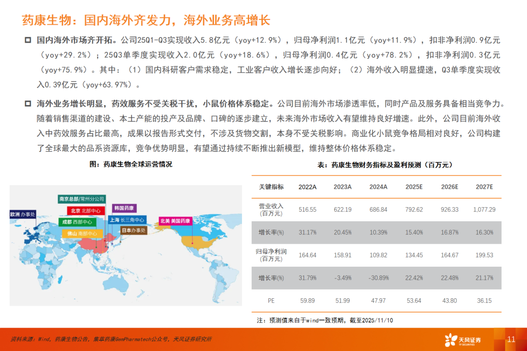 从海外龙头的业绩看,海外整体科研服务需求稳中向好。国内多个科研服务企业海外业务进展顺利,产品认知度持续提升、渠道建设持续完善、海外客户数量持续增长。高毛利的海外业务持续增长,有望带动企业利润端加速扩张。此外,2025年初特朗普对华实施20%的芬太尼关税,截至2025年11月,整体芬太尼关税有望降低,地缘政治的缓和有利于企业加速开拓海外市场。