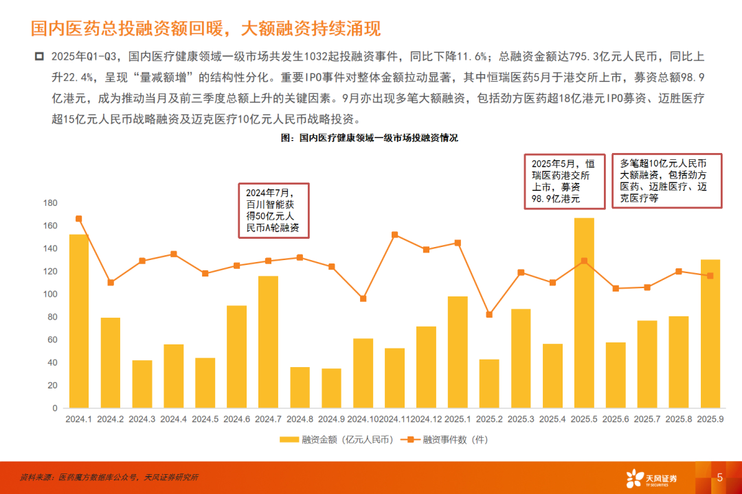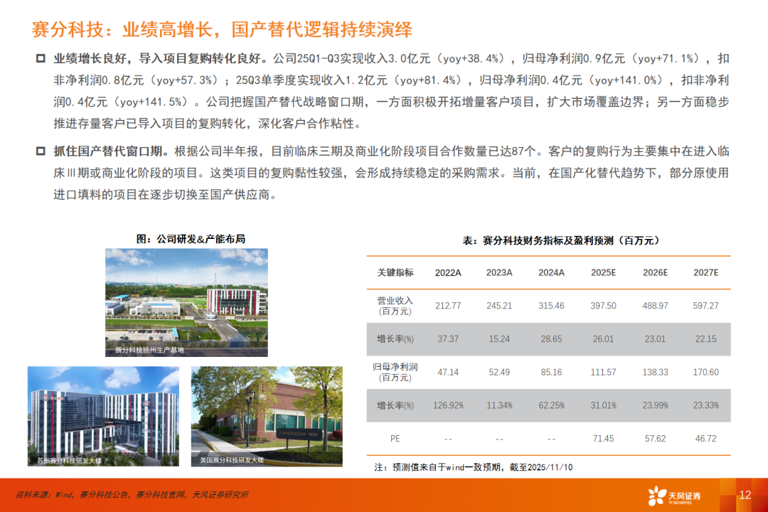 25Q3科研服务板块整体业务良好,收入及利润实现稳定增长。(1)得益于国家政策的支持、重磅的 license-in/out 交易以及行业并购整合加速等因素,创新药的市场关注度和活跃度持续提升。随着创新药行情回暖,产业投入不断增加,重组蛋白、抗体等生物试剂产品及相关服务的需求持续增长,为科研服务板块提供更多业务机会,推动业绩增长。(2)随着产品质量进一步提升,科研服务国产化进入新一轮窗口期,头部企业有望在国产替代逻辑中进一步提升市场份额。