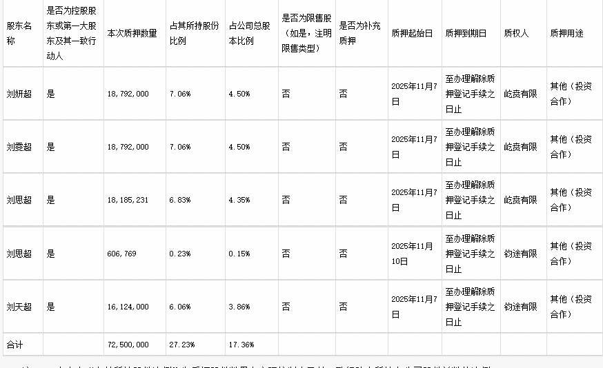 几乎同一时间,亨迪药业公告,刘益谦的一致行动人,也就是他的四个儿女也质押出去了一大笔亨迪药业的股票,市值12亿左右: