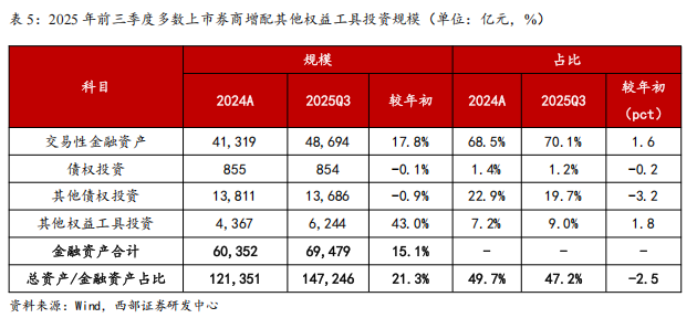 资产配置规模和结构来看,三季度金融资产规模继续扩张。42家上市券商2025年三季度末合计金融资产规模达69,479亿元,较年初增长15.1%,占总资产的比重为47.2%;从配置类型来看,权益市场上行趋势下券商在加大TPL和其他权益工具投资规模,截至2025年三季度末,交易性金融资产、债权投资、其他债权投资、其他权益工具投资规模占比分别为70.1%、1.2%、19.7%和9.0%,较年初+1.6、-0.2、-3.2、+1.8pct,其中华泰证券、中信建投、兴业证券等开始增加其他权益工具投资配置,规模分别由年初的1、148、67亿元增长至105、407、151亿元。