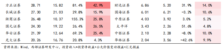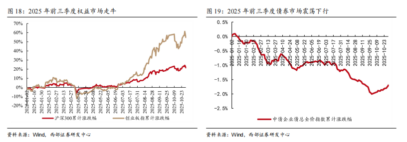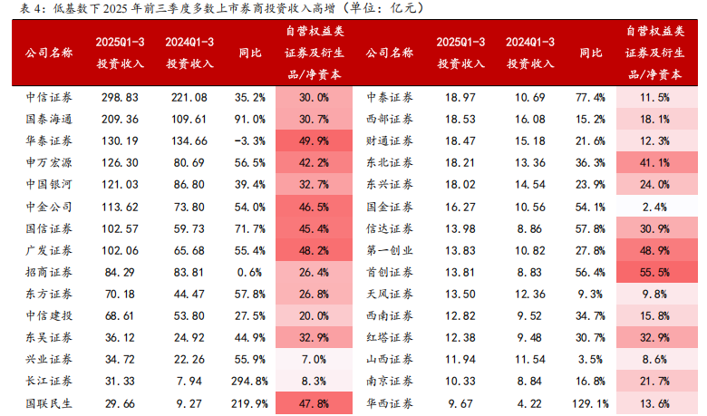 2025年以来券商自营整体同比高增,但风险偏好决定了其增速高低。2025Q1-3,沪深300和创业板指分别较年初+21.5%、+57.2%,中债企业债总全价指数较年初-2%,2025前三季度42家上市券商实现自营投资收入1952.5亿元,同比上升43.3%;其中方正证券、国信证券、广发证券等自营投资收益同比增速较高,分别达到81%、72%、55%,截至三季度末,其自营权益类证券及衍生品占净资本的比重也较高,分别为42.9%、45.4%、48.2%,也有长江证券、华西证券等券商实现自营投资的高增速,分别达到295%、129%,主要系低基数和交易性股票资产配置得来。