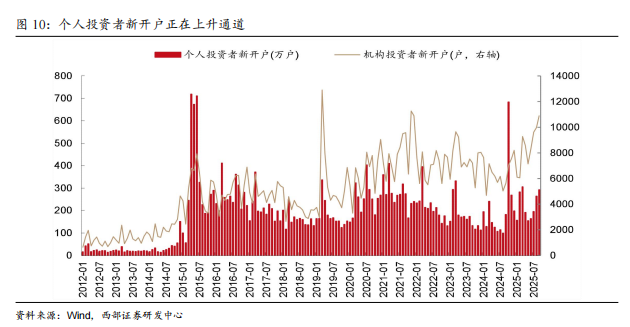 另外,当前个人投资者新开户正在上升通道,2025年9月上交所披露A股新开户数上升至293.72万户,环比增长11%,同比增长61%,但较2024年10月684.68万户仍有较大差距。散户入市热情有所抬升,但相较去年“924”行情增长相对偏缓,预计后续居民自己会持续通过个人股票投资入市。