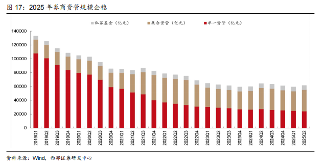 预计2026年券商资管规模或保持稳中有升。截至2025H1,券商资管总规模为6.14万亿元,较年初微增0.7%。收入端来看,前三季度42家上市券商合计资管净收入同比+2.4%至332.51亿元;分公司来看,不同券商资管收入有所分化,主要系多数券商资管产品以固收和固收+产品为主,在三季度债券市场波动下影响较大,例如首创证券、国信证券、财通证券前三季度资管收入分别同比-56.9%、-22.7%、-18.9%至3.22、4.9、9.57亿元。展望未来,券商资管业务的发展方向在于:1)在传统固收投资的基础上,持续丰富ABS、Reits、被动等多元化产品品类;2)持续推动向主动管理转型,积极申请设立子公司及公募牌照或通过收购实现规模扩张。