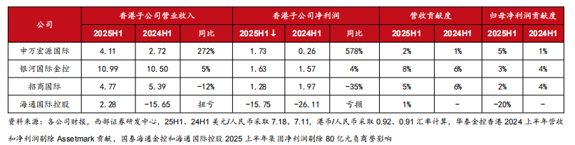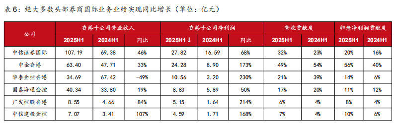 互联互通深化下券商十分重视国际业务发展。随着近年来我国高水平双向开放和人民币国际化进程的持续深化,国际业务已成为驱动券商业绩增长和提升全球竞争力的重要引擎;尤其在2025年以来港股成交发行同比高增下表现尤为明显。2025上半年头部券商国际子公司大多实现净利润的同比高增,其中中信国际、中金香港、华泰国际、国泰海通金控实现净利润27.8、24.3、10.56、8.83亿元,同比+66%、+169%、+230%(剔除2024H1Assetmark贡献)、+50%,分别占集团净利润分别为20.3%、56.1%、14%、11.4%(剔除当期负商誉影响),同比+5pct、+16pct、+8pct、-0.4pct。