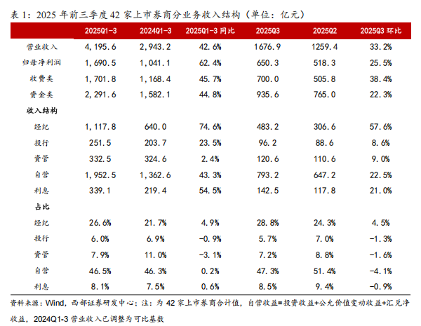 前三季度券商业绩同比高增,经纪两融和自营为主要贡献。2025年前三季度42家上市券商合计实现营业收入和归母净利润分别为4,195.6和1690.5亿元,同比分别+42.6%和+62.4%(扣除国泰海通非经常性损益后归母净利润为1632.8亿元,同比+56.8%);其中单三季度实现营业收入和归母净利润1676.9、650.3亿元,环比+33.2%、+25.5%。分明细来看,经纪业务、投行业务、资管业务、自营业务、利息净收入分别为1117.8、251.5、332.5、1952.5和339.1亿元,同比分别+74.6%、+23.5%、+2.4%、+43.3%、+54.5%,2025年前三季度市场成交大幅增长,大盘指数不断突破,因此行业经纪两融和自营投资收入同比高增;从结构来看,剔除其他业务成本后,经纪业务、投行业务、资管业务、自营业务和利息净收入占比分别为26.6%、6.0%、7.9%、46.5%、和8.1%,同比分别+4.9、-0.9、-3.1、+0.2、+0.6pcts,经纪自营业务收入占比继续提升。