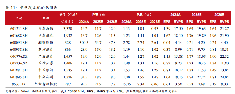 中国银河:1)公司线下营业部保持行业第一梯队,零售经纪业务优势显著,显著受益于市场交投回暖;2)公司业绩表现稳健,2025年以来行业排名稳居行业第四,发力机构业务,有望为公司带来第二条增长曲线。预计 2025-2026年BPS分别为11.53/13.04元,11月14日股价对应PB为1.46/1.29倍,维持“增持”评级。