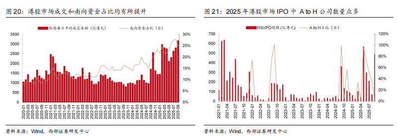 2025年内地和中国香港市场的互联互通持续加深,资产资金南下趋势明确。2024年4月,证监会发布5项资本市场对港合作措施,旨在加强两地市场互联互通,支持内地行业龙头企业赴中国香港上市。成交方面,2025年以来港股市场成交十分活跃,2025年前三季度港股市场ADT约2,564亿港元,同比+ 126.4%,其中南向资金占比提升至21%-28%;发行方面,2025年前三季度港股市场共69家新股上市,募资规模1883亿港元,同比+229.1%;其中A股上市公司赴港上市规模为1306亿港元,占比高达71%。2025年以来南向资金占比和A to H上市公司比例不断提升,两地资本市场互联互通进一步深化。