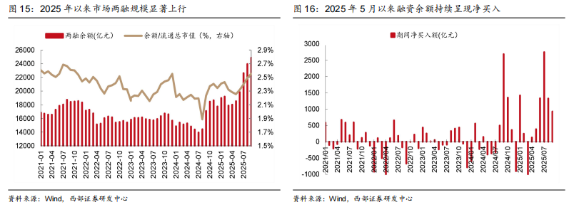 5月以来一直呈现融资净买入,预计两融余额将有提升空间。2023年以来,监管持续强化融券业务逆周期调节,目前规模已基本压降至低点;而融资规模的变化与市场风险偏好直接相关。2025年成交活跃、指数上行推动融资业务大幅改善,融资净买入额在8月提升至2744.45亿元,超过2024年10月高点2684.03亿元。截至2025年10月末,市场两融余额24,864亿元,环比+3.9%、同比+45.5%,占流通市值的比重提升至2.55%;显著高于2024年平均水平(15,663亿元)。预计未来权益市场稳健上行下两融余额仍将提升,华泰证券、中信证券等两融市占率较高的券商更为受益。
