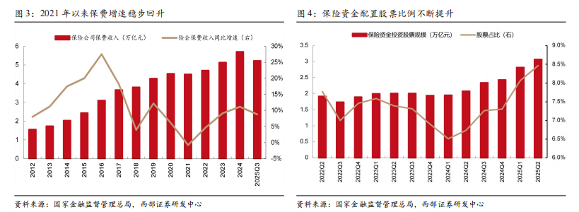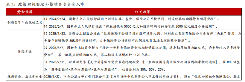 监管积极鼓励保险资金入市,预计保险资金仍为市场重要的增量资金来源。2025年1月国新办上证监会提出“大型国有保险公司力争每年新增保费30%用于投资股市”,监管倡导下保险资金或将稳步提升股市投资比例。2025年前三季度保险公司实现新增保费收入5.21万亿元,同比增长8.8%;当前传统险/分红险预定利率分别为2%/1.75%,较银行定存具有比价效应;且分红险“固收+”的收益特征符合居民投资需求,预计未来保费收入仍维持稳定增长。截至2025年二季度末,保险公司资金运用余额为36.2万亿元,其中投资股票规模为3.1万亿元,占比为8.5%,2024年以来险资股票配置比例持续提升。