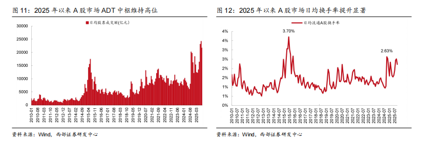 投资者入市情绪转暖,市场交投活跃有望延续。2024年924市场反转以来A股市场成交量显著放大,2025年1-10月A股ADT为16,933亿元,同比+86.6%;A股日均换手率均值为1.97%,相较于2024年日均换手率均值1.5%提升显著。我们认为目前市场换手率相较于2015年牛市换手率(2015Q2 A股日均换手率3.27%)还有一定距离,未来随着增量资金持续入市,预计市场成交中枢将维持较高水平。