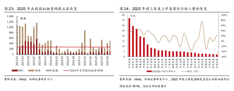 预计未来港股成交发行延续活跃,数字资产也将成为国际业务的重要布局方向。1)成交方面,2025年1-9月港股成交同比+增长126.4%,截至2025年9月南向资金占比提升至25%,后续预期人民币升值和美联储降息背景下,预计外资将持续流入港股市场,港股成交活跃度有望继续提升;2)发行方面,在证监会支持内地行业龙头赴港上市以来,已有宁德时代、恒瑞医药、三一重工等行业龙头赴港上市,预计后续港股发行将持续修复。另外2025年6月,中办、国办印发《关于深入推进深圳综合改革试点 深化改革创新扩大开放的意见》,提出“允许在港上市粤港澳大湾区企业按规定在深交所上市”,预计后续中资投行在此方面也大有可为。