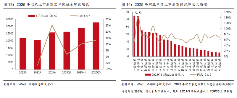 市场活跃下券商客户资产环比增长,股基市占率和经纪收入占比高的券商更为受益。截至2025Q3末,我们统计范围内的42家上市券商客户资产显著增长,上市券商合计客户保证金(客户资金存款+客户备付金)达3.25万亿元,较年初增长27.4%。市场成交活跃推动券商经纪净收入高增,2025年前三季度42家上市券商合计经纪业务收入为1117.8亿元,同比+74.6%,其中方正证券、国信证券等经纪基础较好的券商经纪净收入分别同比+81.4%、+109.3%。展望2026年,我们认为各类增量资金将会持续流入资本市场,权益市场或维持稳定上行,市场成交将维持在较高中枢,为券商经纪业务开展提供支撑;股基市占率高的头部券商更为受益。此外,当下财富管理渠道端获客正转向以短视频、支付宝、社交内容平台为代表的公域流量场景,AI技术的创新也为财富管理服务方式提供了新的可能,线上获客能力较强、具备互联网基因的券商有望在新开户中抢占更多份额。