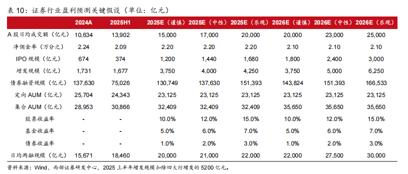 基于中性假设,预测2025全年证券行业分别实现营业收入和净利润5,561、2,502亿元,同比分别+23.3%、+49.6%;2026 全年证券行业分别实现营业收入和净利润6,718、3,090亿元,同比分别+20.8%、+23.5%。市场交投活跃下经纪两融和自营投资是2025年券商业绩的核心增量贡献,资管业务收入保持稳定,投行收入在低基数下迎来边际改善。展望2026年,我们预计增量资金持续入市下成交仍将维持较高中枢,经纪业务及两融收入仍将有所表现,投行收入继续边际修复,赚钱效应加强下资管收入将企稳回升,若市场保持平稳或不断向上,权益投资的重要性将进一步放大,自营投资业务整体将会延续较好表现。