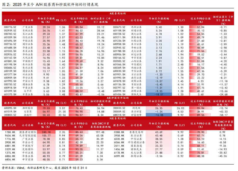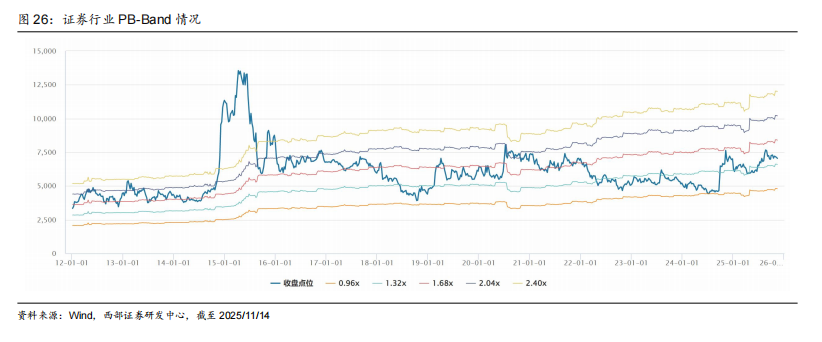 阶段三(8/28-10/31):交易因素影响下进入震荡阶段。在此阶段,制约券商板块投资的核心问题由基本面层面逐步过渡到交易层面,与此同时指数在科技行情推动下不断攀升;在此阶段A股券商和炒股软件分别下跌3.7%和8.2%,分别跑输沪深300指数9.5、14.0pct,H股券商累计下跌4.7%,跑输恒生指数7.5pct。截至2025年10月末,证券Ⅱ(申万)指数估值为1.43xPB,处于2016年以来40%分位数;中资券商指数估值为0.87xPB,处于2016年以来69%分位数。