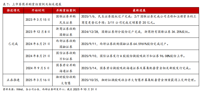证券行业并购重组持续进行,但新增并购较为缓慢。自2023年11月,证监会提出“支持头部券商通过并购重组做优做强”,2024年4月12日新“国九条”提出“支持头部机构通过并购重组、组织创新等方式提升核心竞争力”以来,证券行业并购重组浪潮重现,截至目前国联证券换股吸收民生证券、国泰君安换股吸收海通证券、国信证券换股吸收万和证券,浙商证券收购国都证券部分股权、西部证券收购国融证券部分股权已经完成;湘财股份拟换股吸收大智慧为2025年新增的收购,目前进入上交所受理阶段;此外行业暂无新增并购重组案例,我们认为随着行业盈利提升估值走高,并购层面交易难度或有所提升,但监管政策指导下我们认为行业供给侧改革趋势延续,行业并购重组或会继续发生。