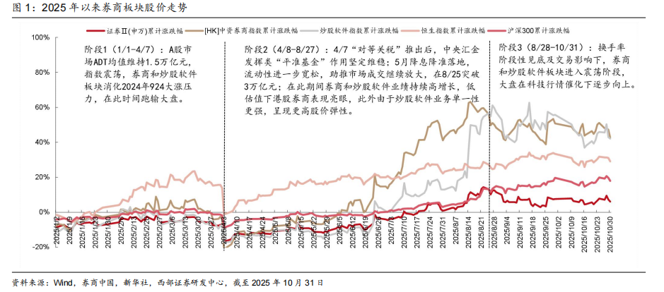 2025年1-10月的券商股走势可以分为三个阶段,其中市场风险偏好和交易因素成为核心矛盾。2024年924后,“1+N”政策陆续出台,中长期资金接续入市,资本市场进入触底反弹的新阶段,在2025年10月29日重新站上4000点;但中美关系、宏观环境在2025年也发生一定波动,市场风险偏好随着变化。第一阶段在前期资金获利了结和对中美关系的担忧下券商和炒股软件板块整体震荡,第二阶段券商和炒股软件板块跟随市场成交和风险偏好一路走高,第三阶段在交易因素影响下券商股进入震荡阶段。