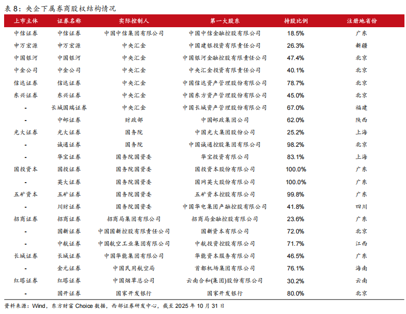 目前我国大多数证券公司以国资持股或控股为主。截至2025年10月末,证监会公布的证券公司名录扣除外资系券商、资管子、保荐子等各类子公司后,共有96家券商;按照股东背景可分为央企下属券商、地方国资系券商、民营券商及混合所有制券商共4类;其中央企下属券商与地方国资系券商共同构成我国券商行业的主导力量。截至2025年10月末,我国央企系券商共计 22 家,占券商总体数量的 22.92%;地方国资系券商达 51 家,占比 53.13%,两者合计占比超七成,成为行业发展的核心支柱。展望后续,我们认为同一股东下的或同一省份内的股权划转仍是可行性相对较高的操作方式。