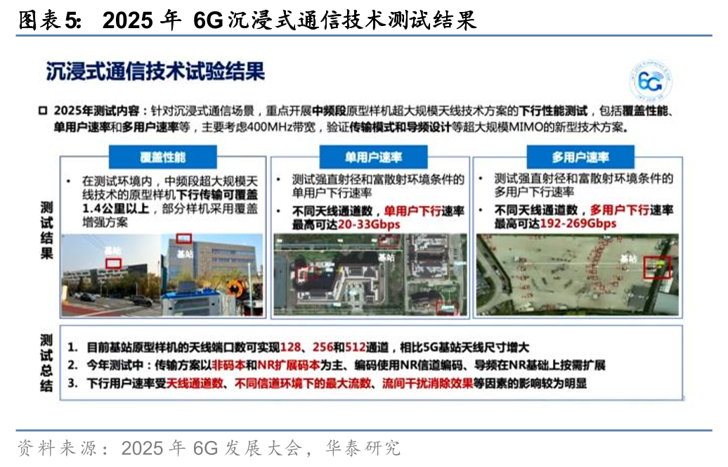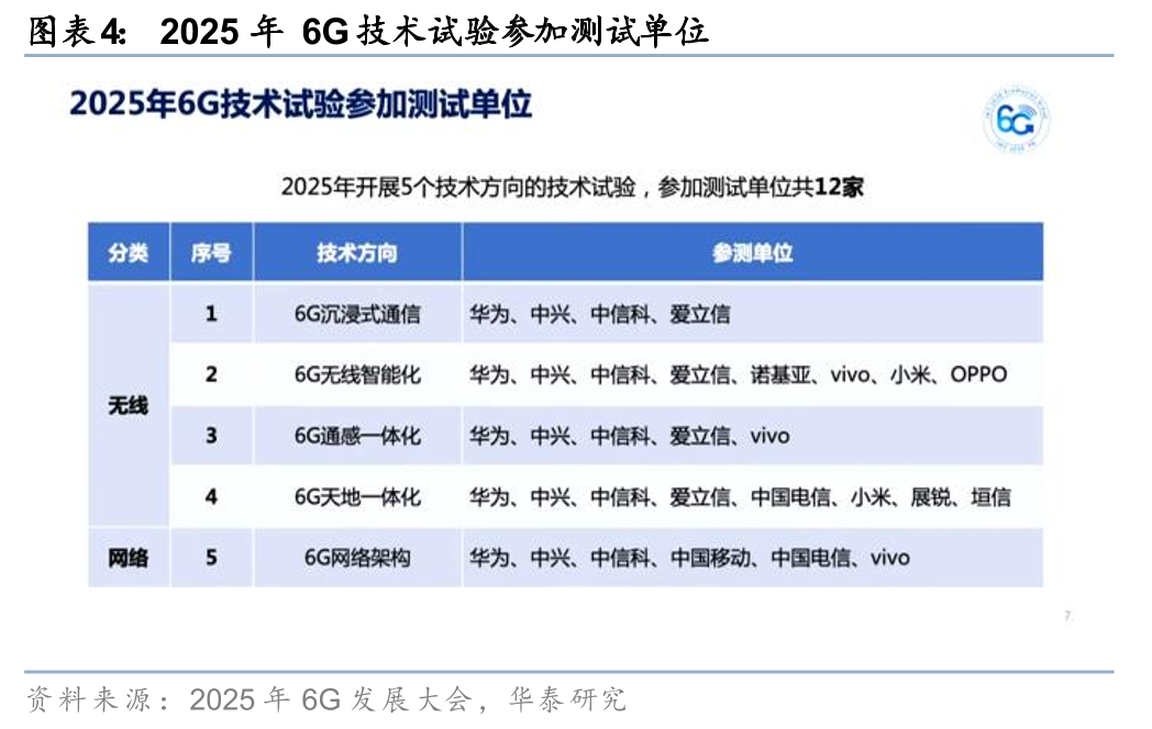 围绕6G发展需求,我国积极进行各项技术试验,为6G赋能经济社会智能化升级提供技术基础。工业和信息化部数据显示,我国体系化推动6G关键技术、网络架构和系统设计等创新研究,广泛开展6G技术征集,形成超300项6G关键技术储备。本次大会上,中国信息通信研究院副院长王志勤代表IMT-2030(6G)推进组,介绍了6G研究进展和2025年6G技术试验情况。王志勤表示,IMT-2030(6G)推进组围绕愿景需求、系统架构、无线技术、网络技术、安全技术等开展系统性研究,提出了6G智能原生系统架构设计,累计发布了80余份研究成果。王志勤介绍了2025年6G技术试验情况,汇报和分析了面向沉浸式通信、无线智能化、通感一体化、天地一体化、网络架构等技术方案的试验结果,为促进业界技术共识形成提供试验依据。我们观察到,华为、中兴、中信科在今年5个技术方向的技术试验中均参加测试,展现出作为通信龙头企业的技术积淀。