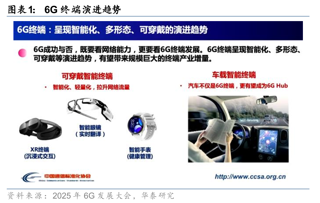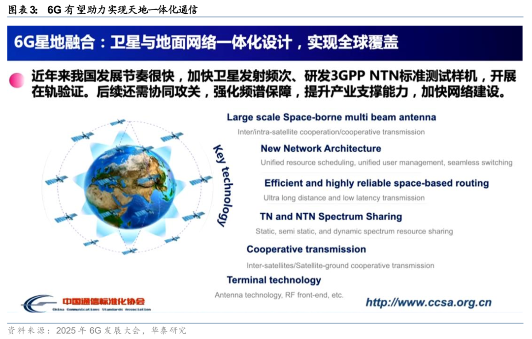 6G作为新一代智能化综合性数字信息基础设施,将突破传统移动通信范畴,实现通信与智能、感知、计算、安全等深度融合。本次大会上,中国通信标准化协会理事长闻库提出了6G“终端、通智融合、星地融合”三大重点突破方向。在终端层面,将打破传统手机单一形态,向智能化、多形态、可穿戴化演进,同时车载终端将升级为“移动无线枢纽”,实现交通工具与通信终端的深度融合;通智融合层面,6G时代将实现人工智能与网络的双向赋能,让网络从“被动承载”转向“智能感知”,实现通信与智能的原生融合;星地融合层面,通过卫星与地面网络一体化组网,破解传统地面通信覆盖局限,实现全球无缝连接,完成天地一体化通信的融合突破。我们认为,6G将不单聚焦于更高的通信传输速度,更要强调与其他ICT技术的深度融合,推动万物互联向万物智联发展。