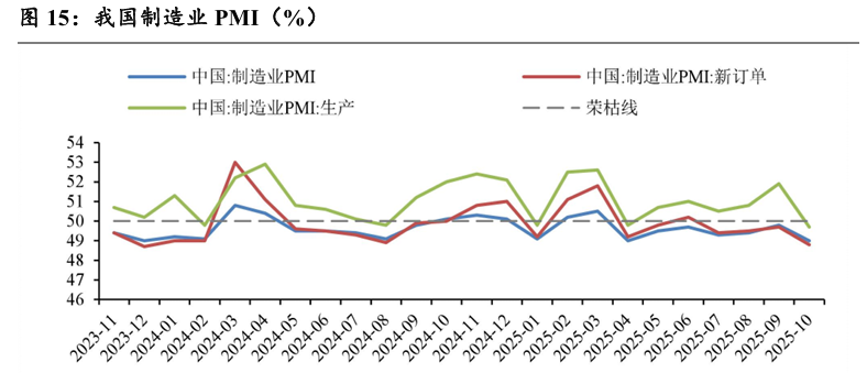 受到短期季节性因素和外部环境复杂性的影响,2025年10月我国制 造业PMI为49%,同比-1.1pct,环比-0.8pct,制造业景气水平有所回落。